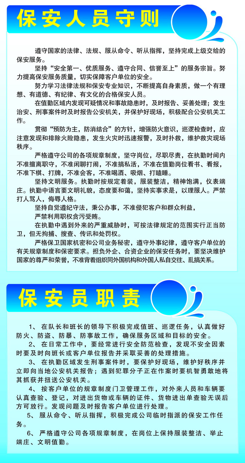 我公司成立于2010年9月,注冊資金550萬元,服務范圍包括:門衛、巡邏、非武裝押運、守護、隨身護衛、安全技術防范、區域秩序維護、保安器材銷售等。