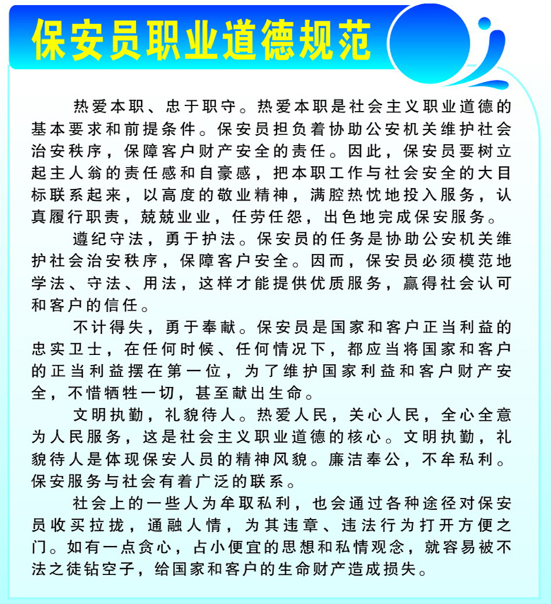 公司行政管理人員均具有多年保安服務工作經驗,政治思想好,業務素質精,熱心奉獻于保安事業。